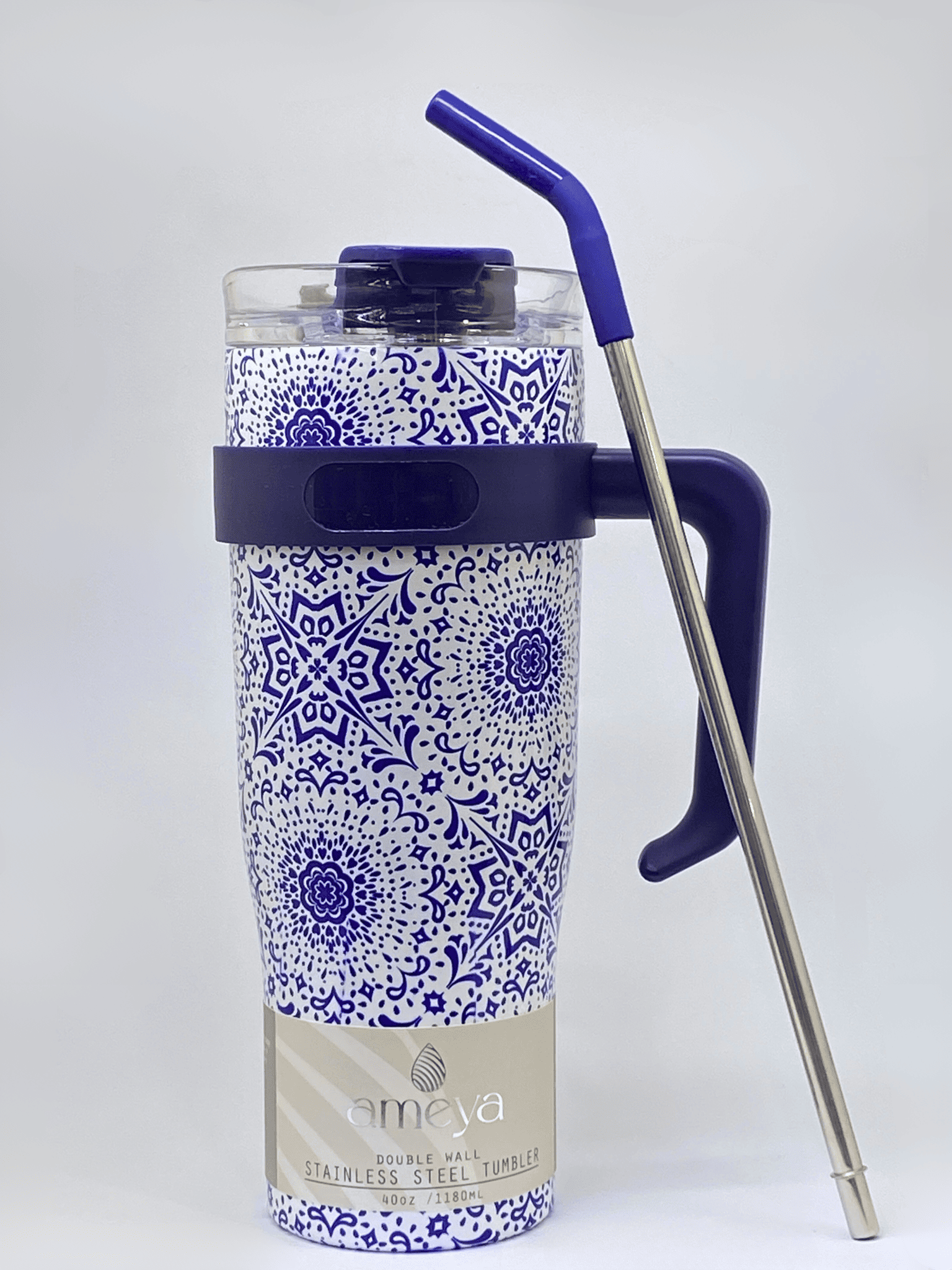 Stay hydrated in style with the Ameya 40oz (1180ml) Stainless Steel Tumbler, featuring a stunning blue mandala design and a comfortable side handle for easy grip. Built with double wall insulation, it keeps your drinks hot or cold for hours—perfect for home, office, travel, or workouts. Includes a reusable metal straw with a soft silicone tip for a smooth, eco-friendly sipping experience.