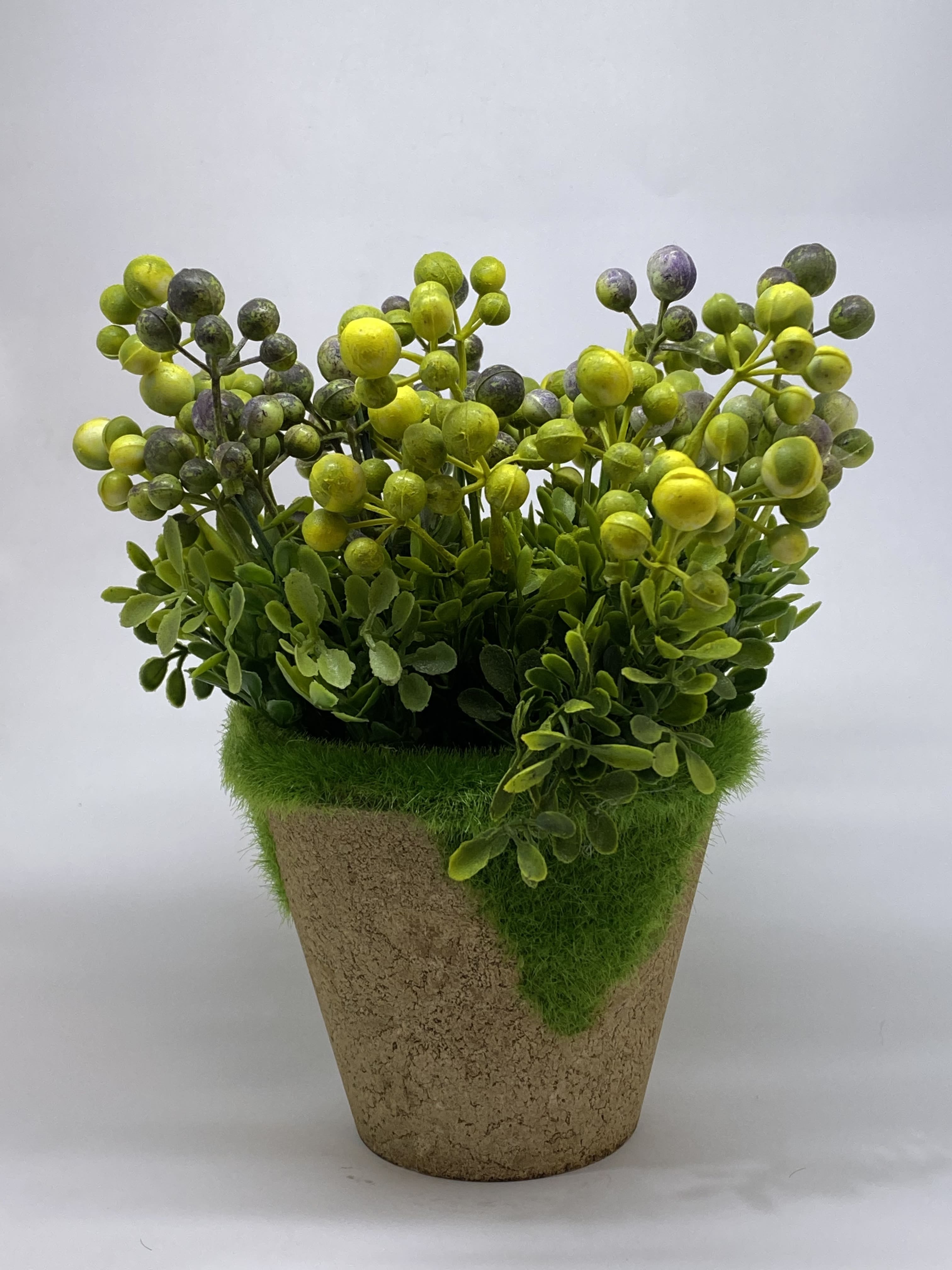 This artificial plant features a mix of green and subtle purple berries with lush green leaves, set in a decorative pot with soft faux grass trim. A perfect, maintenance-free accent to brighten up any room, desk, or shelf.