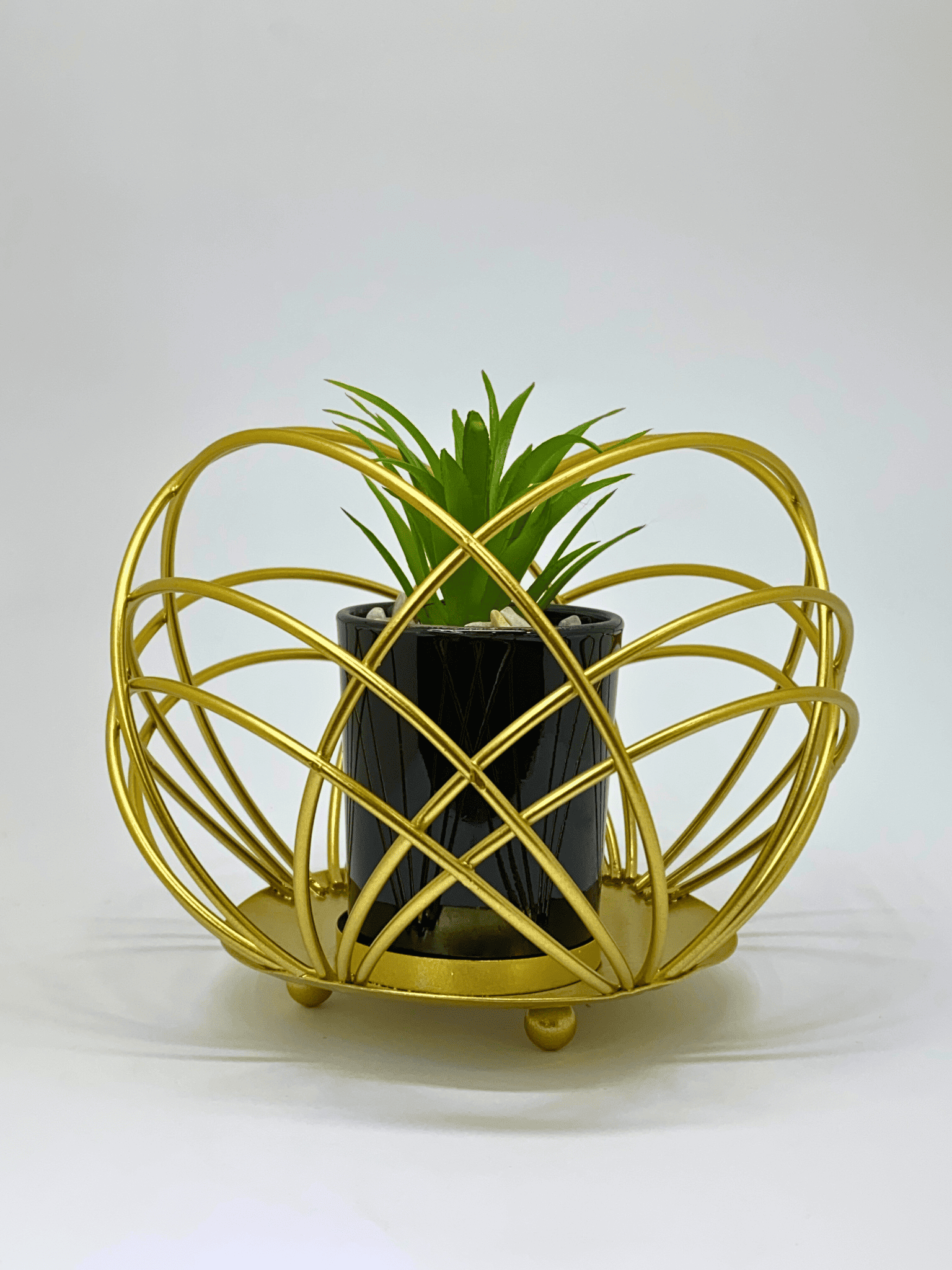Sleek, stylish, and effortlessly eye-catching — this medium-sized artificial plant sits in a glossy black pot, cradled by a stunning gold orb-shaped metal cage. Its modern design adds a sculptural touch to any space.