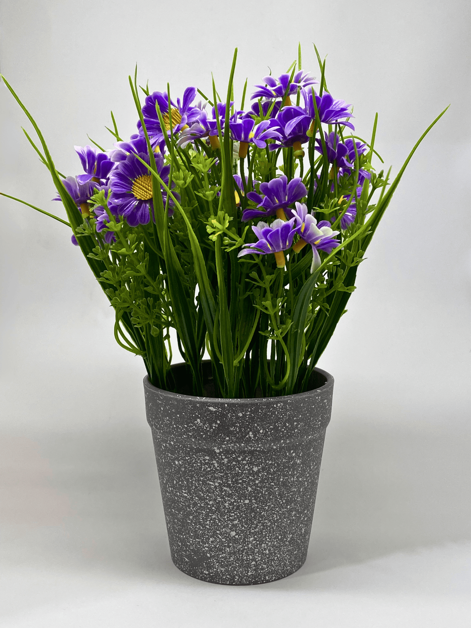 Elevate your interior decor with this vibrant artificial purple flower plant, set in a modern stone-textured pot. The lush greenery and vivid purple blooms bring a touch of nature and elegance to any room, shelf, or workspace.