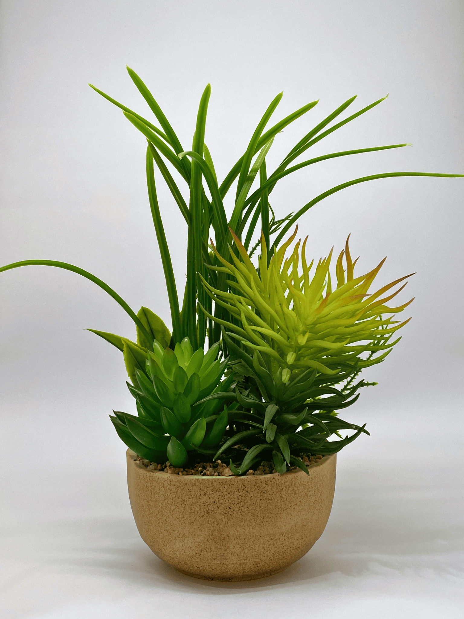 Elevate your space with this lifelike artificial succulent arrangement. Styled in a neutral-toned pot, it adds a refreshing pop of greenery to any room. Ideal for decorating shelves, desks, or tabletops in your home or office.