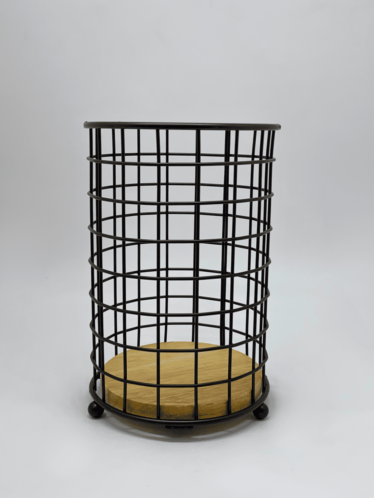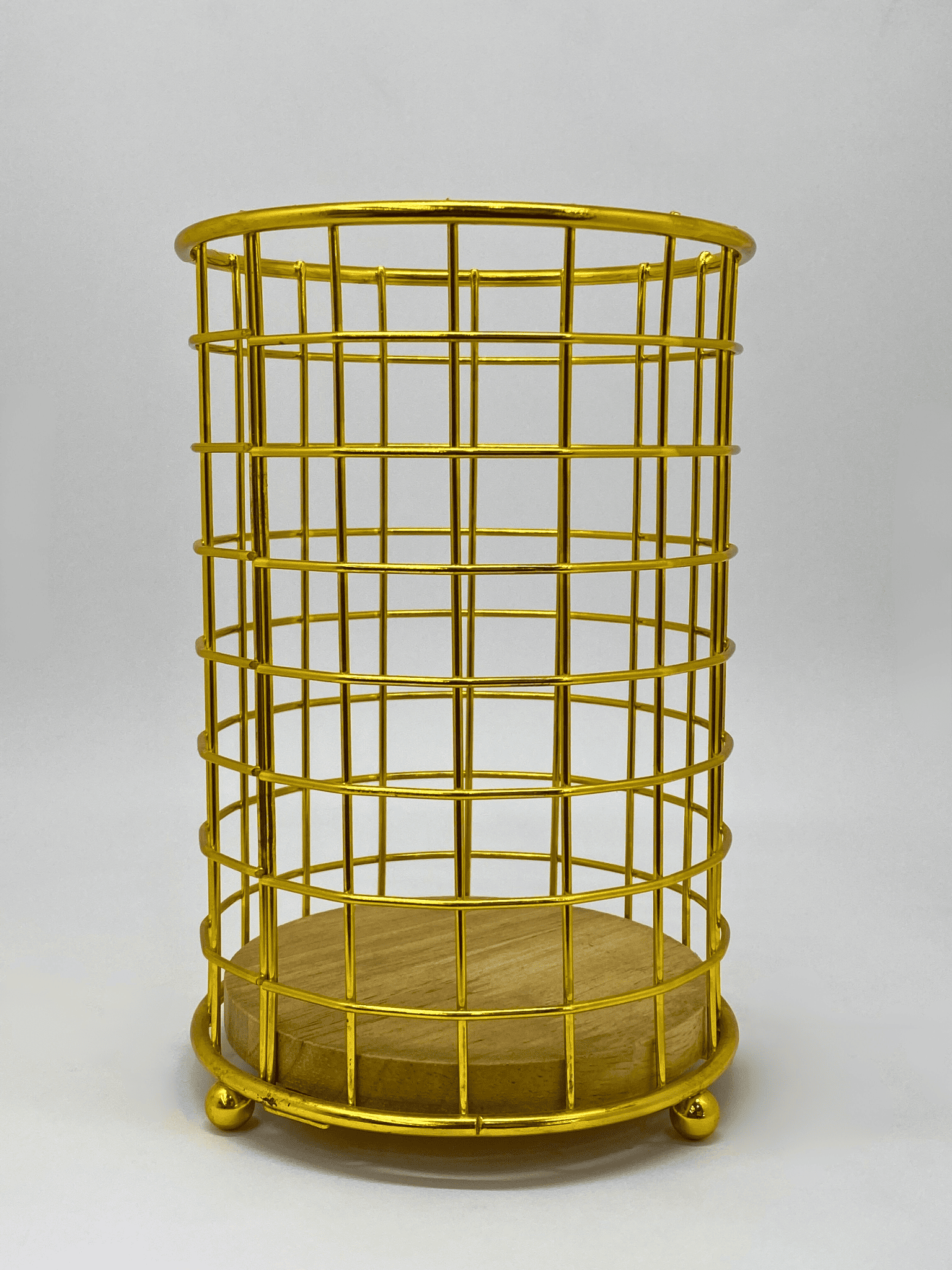 Organize your kitchen with this gold/black metal utensil holder featuring a wooden base, ideal for spoons, forks, and more.