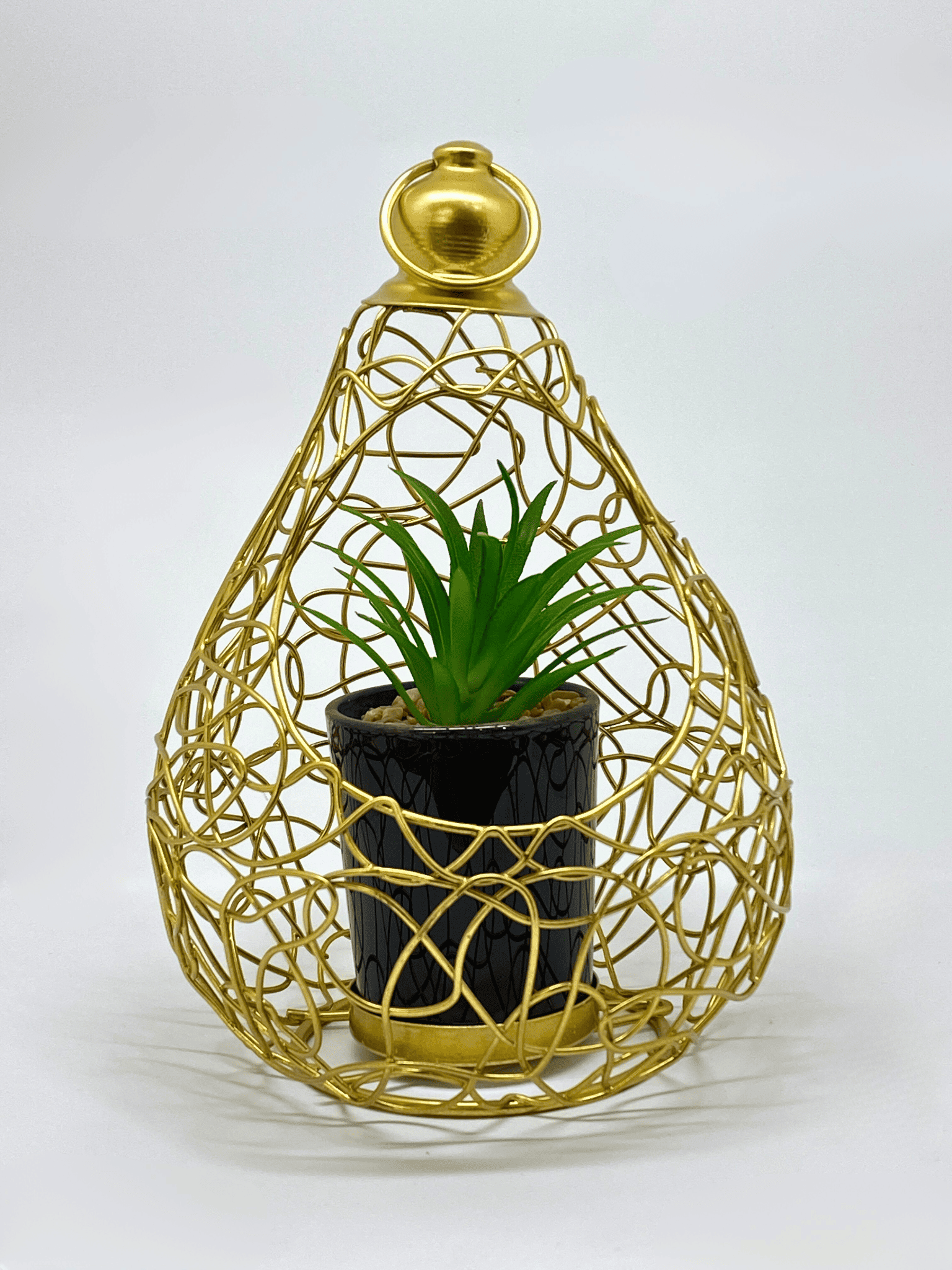 Medium Teardrop-Shaped Golden Wire Planter – with Faux Greenery