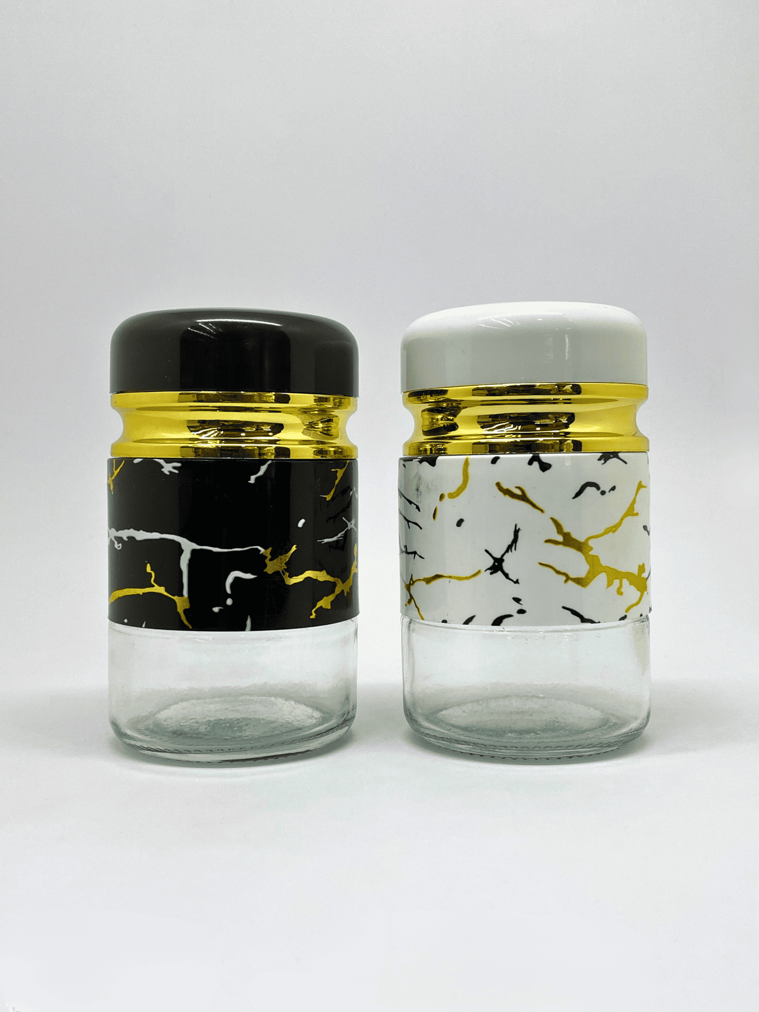 Enhance your dining experience with this pack of 2 marble-effect glass salt and pepper shakers. Designed in black and white with gold accents, they feature different modes with multiple holes for fine or coarse seasoning. Perfect for your kitchen or table.