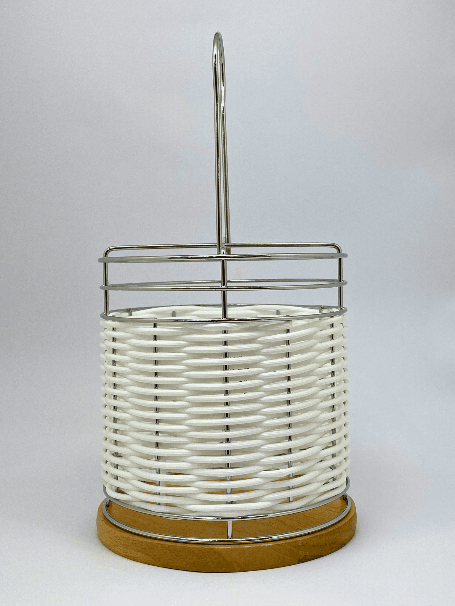 Stylish white woven multi-purpose holder with a metal frame and wooden base, perfect for organizing various items.
